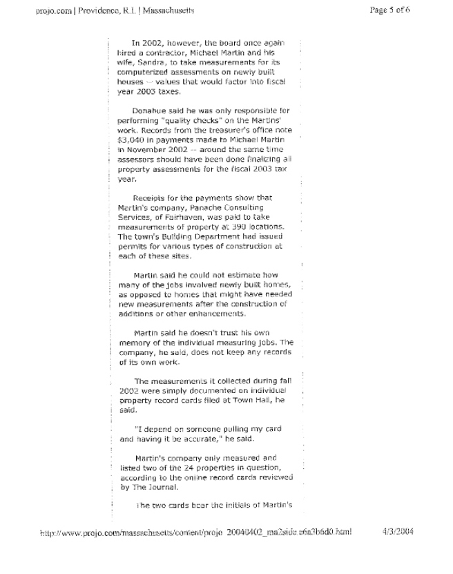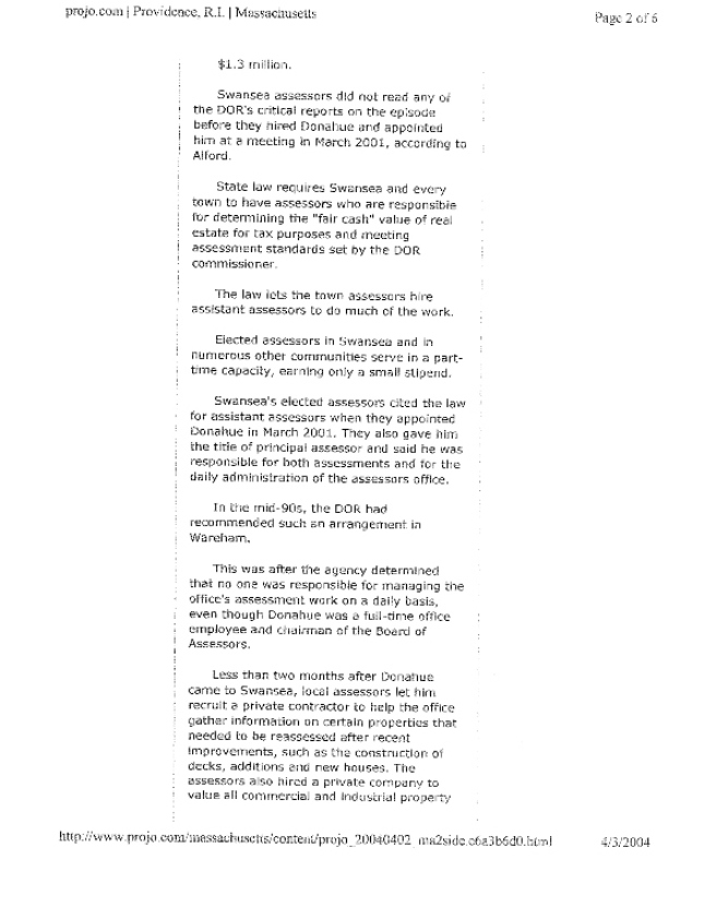 In March, a Providence Journal investigation showed that Donahue's office cost the town an estimated $53,000 because 23 of the newest houses had not been assessed to their full value. Almost $4 million worth of new construction didn't make it onto the 2002-03 tax rolls, according to the investigation.